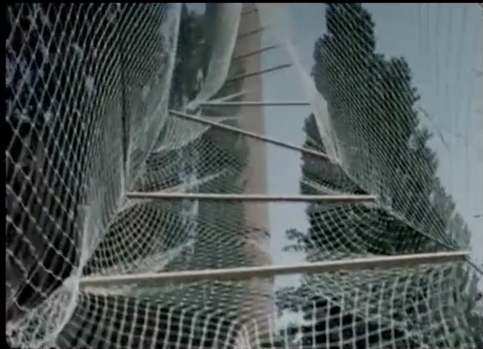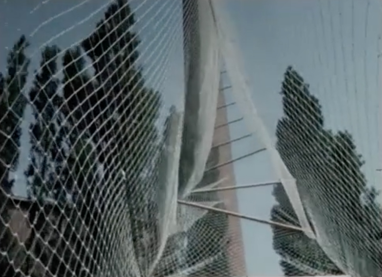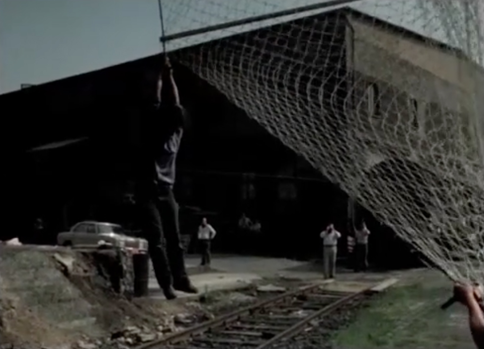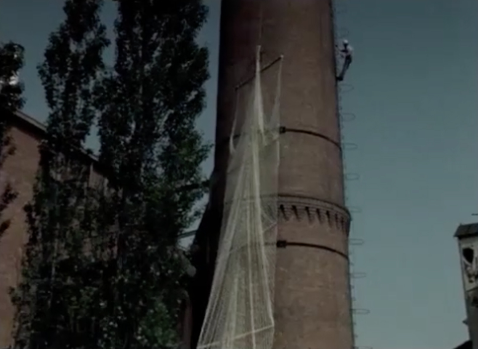 Me encantaría poder transcribir los sentimientos contradictorios que muestran la clara expresión de Matta-Clark, hacia el final de la filmación, cuando después de tensar y tensar la pesada red a la altísima chimenea, surge la discusión de dejarla en su arco perfecto, pues si se sigue buscando la diagonal, se corre el peligro de que los palos travesaños que la mantienen abierta rompan, o bien la chimenea no aguante… perfecta alegoría instantánea de la lucha interna entre dejar la obra en su estado o buscar el colapso. Grande Matta-Clark, que decide dejar de forzar la polea tractel para dejar una impresionante Escalera de Jacob de casi 80 metros, en el extrarradio de Kassel.