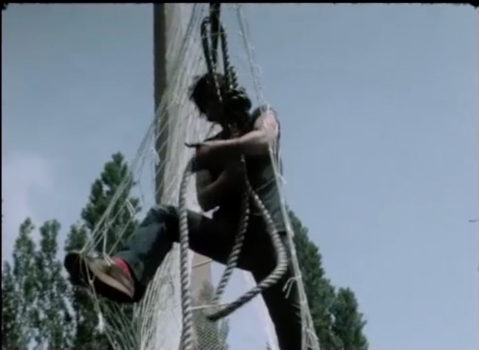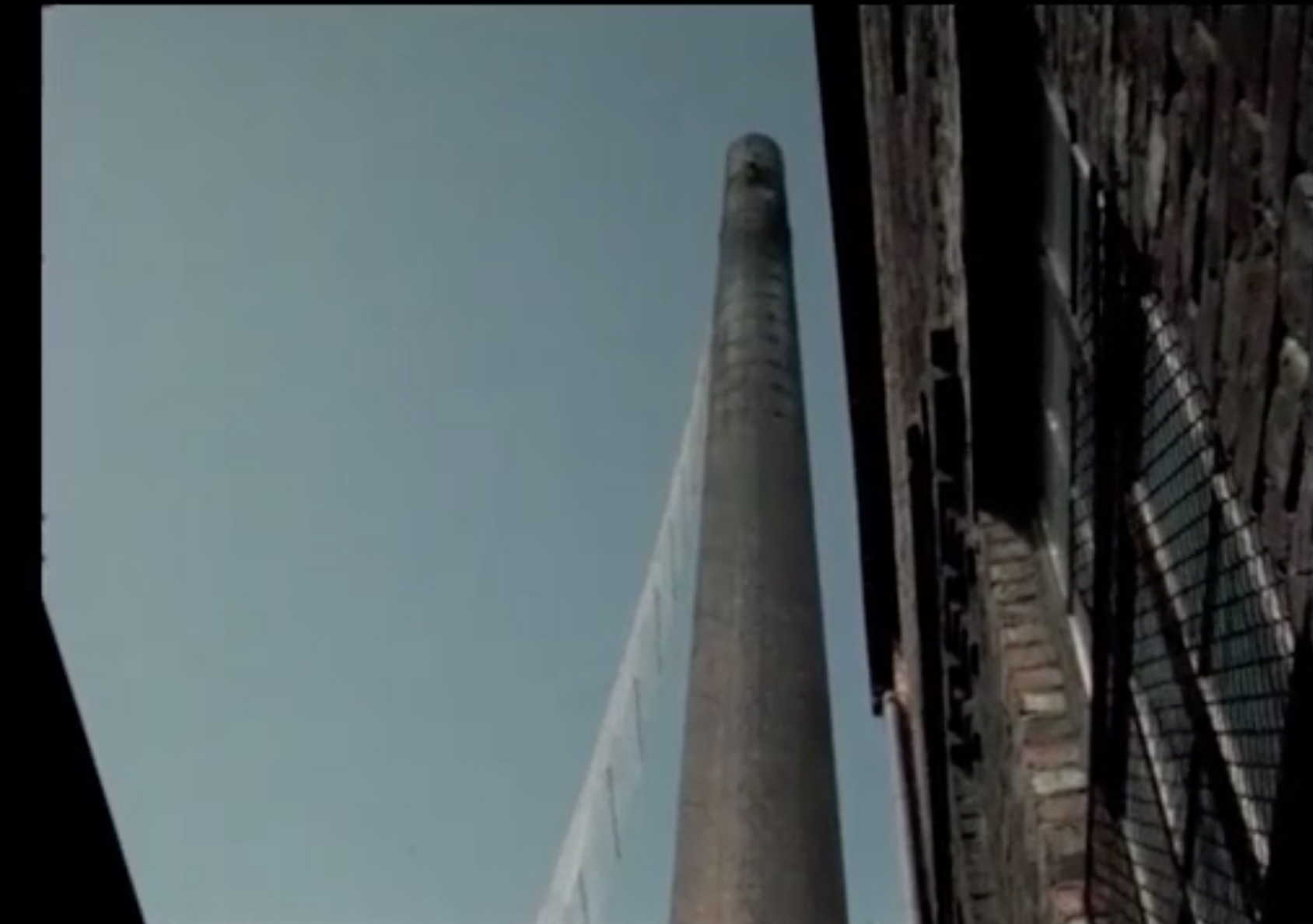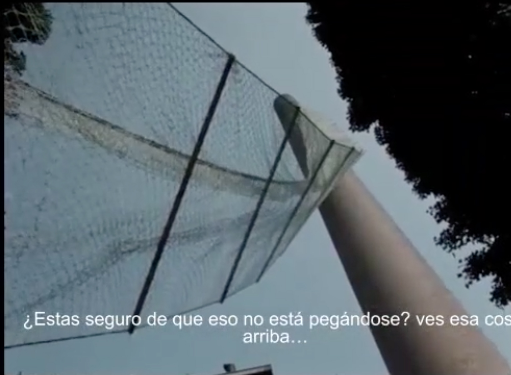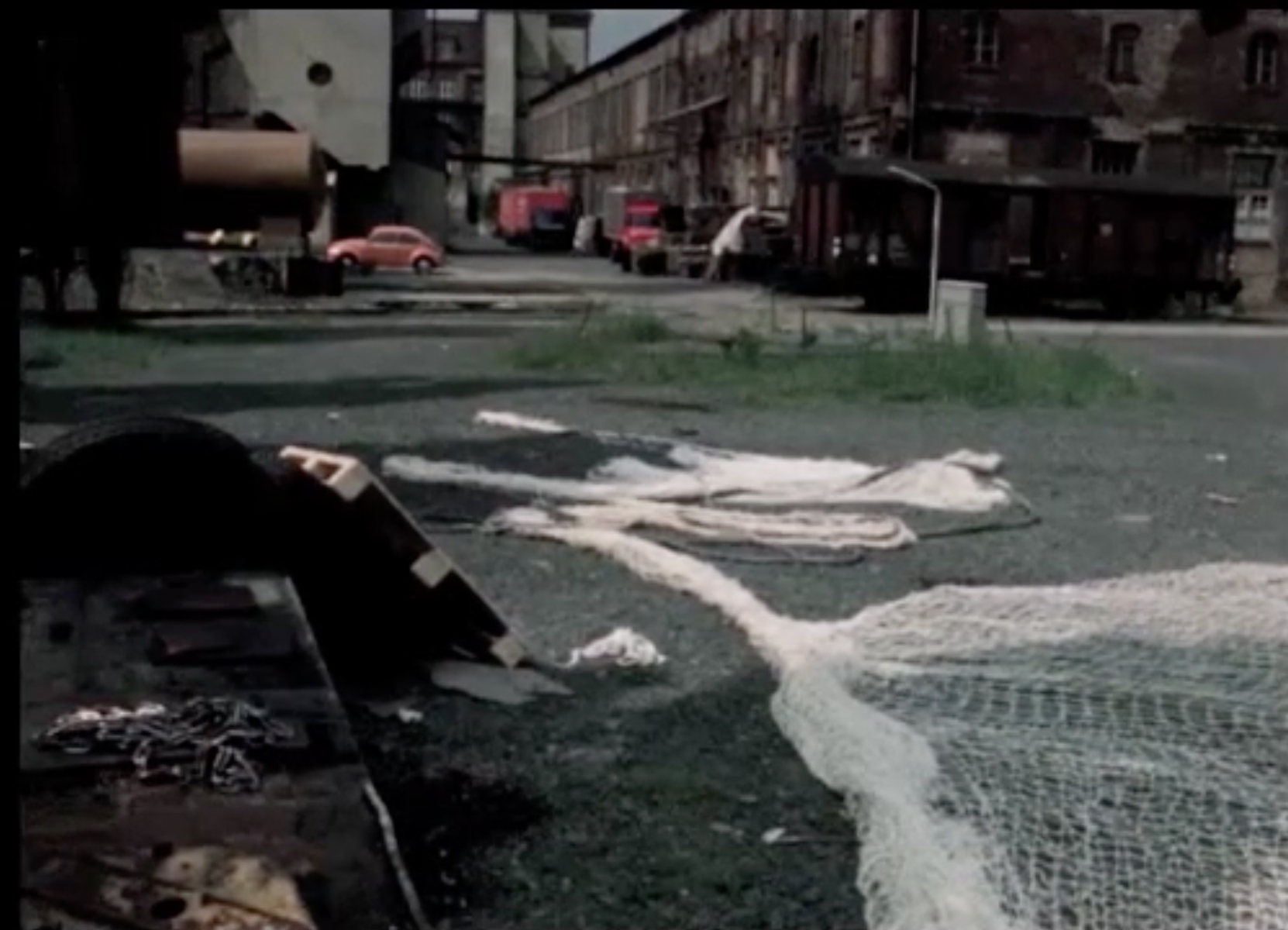 Me encantaría poder transcribir los sentimientos contradictorios que muestran la clara expresión de Matta-Clark, hacia el final de la filmación, cuando después de tensar y tensar la pesada red a la altísima chimenea, surge la discusión de dejarla en su arco perfecto, pues si se sigue buscando la diagonal, se corre el peligro de que los palos travesaños que la mantienen abierta rompan, o bien la chimenea no aguante… perfecta alegoría instantánea de la lucha interna entre dejar la obra en su estado o buscar el colapso. Grande Matta-Clark, que decide dejar de forzar la polea tractel para dejar una impresionante Escalera de Jacob de casi 80 metros, en el extrarradio de Kassel.