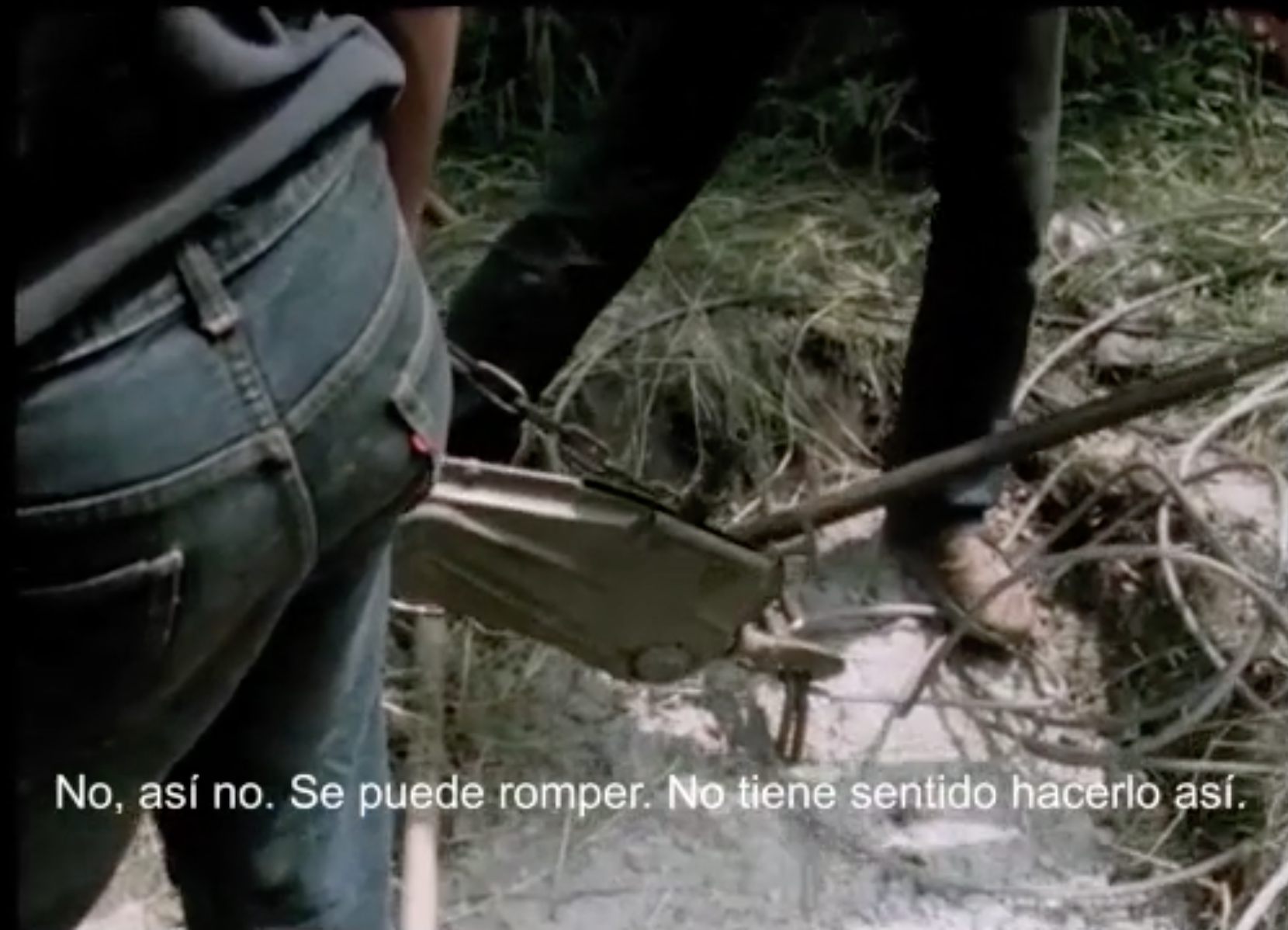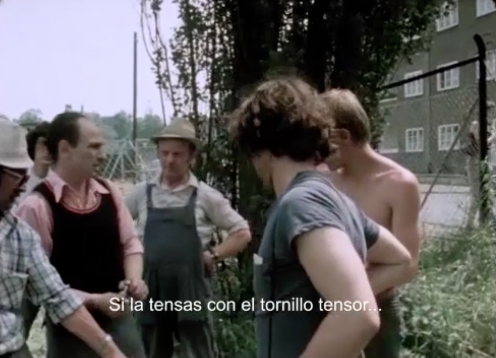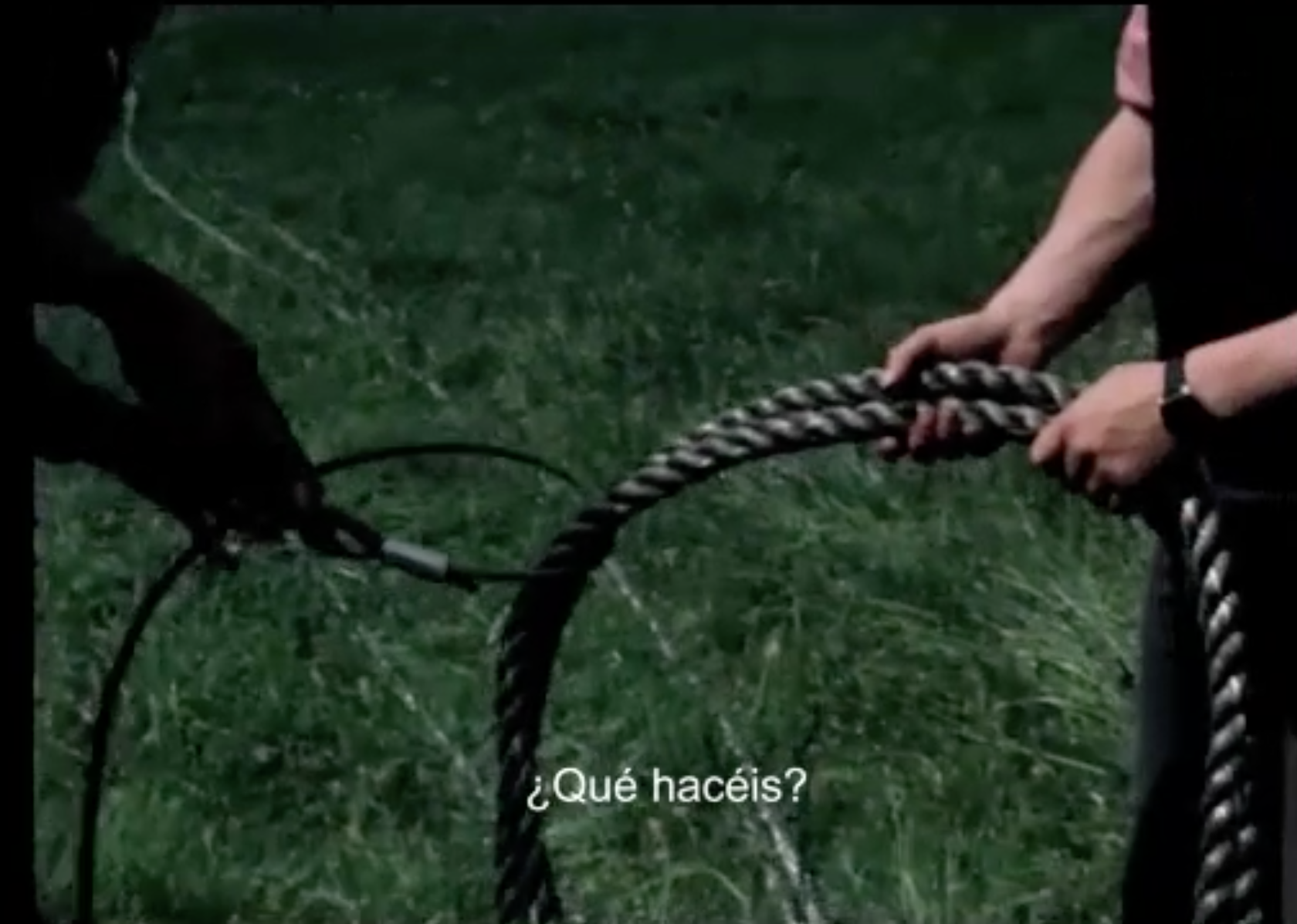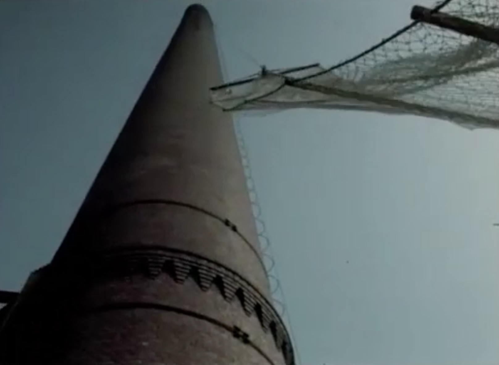 Me encantaría poder transcribir los sentimientos contradictorios que muestran la clara expresión de Matta-Clark, hacia el final de la filmación, cuando después de tensar y tensar la pesada red a la altísima chimenea, surge la discusión de dejarla en su arco perfecto, pues si se sigue buscando la diagonal, se corre el peligro de que los palos travesaños que la mantienen abierta rompan, o bien la chimenea no aguante… perfecta alegoría instantánea de la lucha interna entre dejar la obra en su estado o buscar el colapso. Grande Matta-Clark, que decide dejar de forzar la polea tractel para dejar una impresionante Escalera de Jacob de casi 80 metros, en el extrarradio de Kassel.