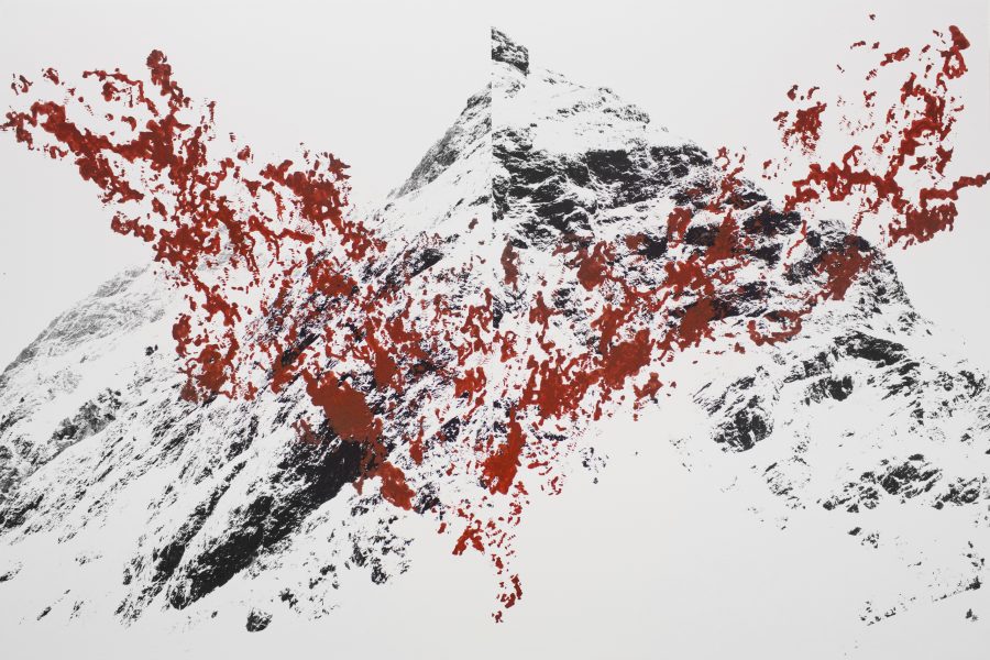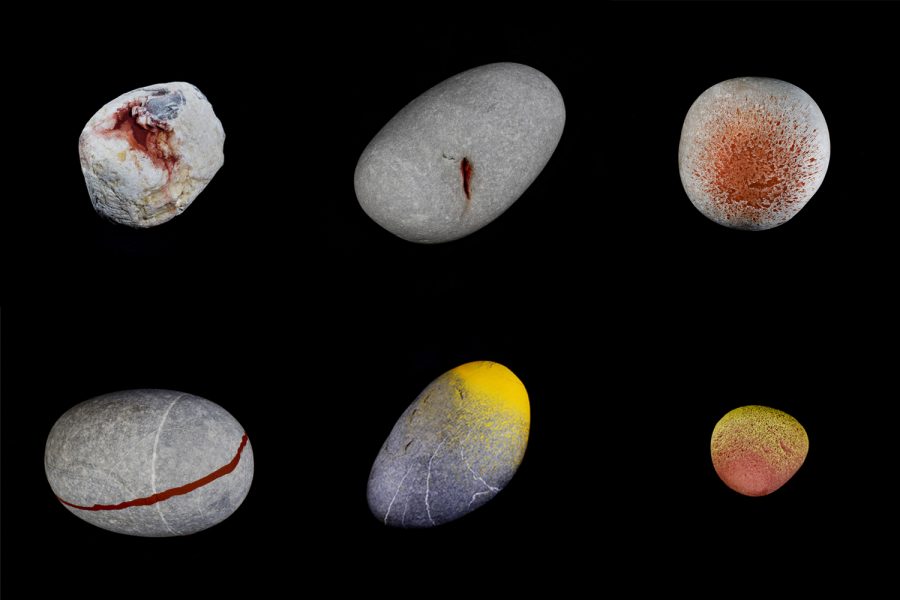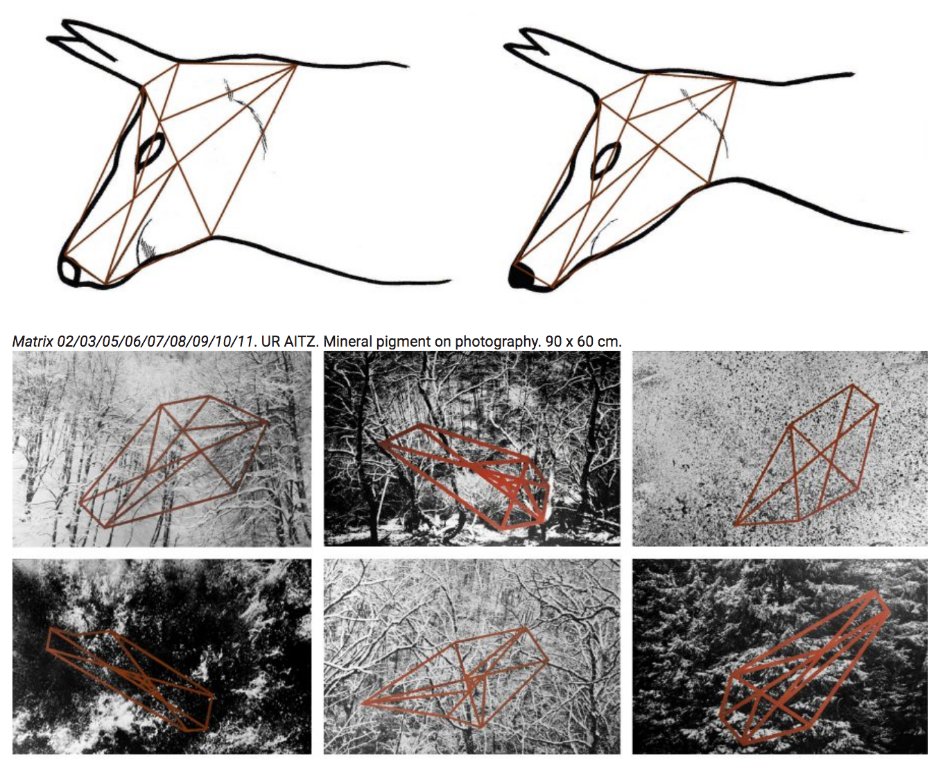 En UR AITZ Cazenave utiliza la intervención con pigmentos naturales tanto sobre fotografías de paisaje -en una suerte de homenaje al gesto primigenio del hombre en la cueva- como en piedras; un gesto mediante el cual el artista ahonda en la importancia de la experiencia corporal -del caminar- y de su encuentro con la naturaleza.