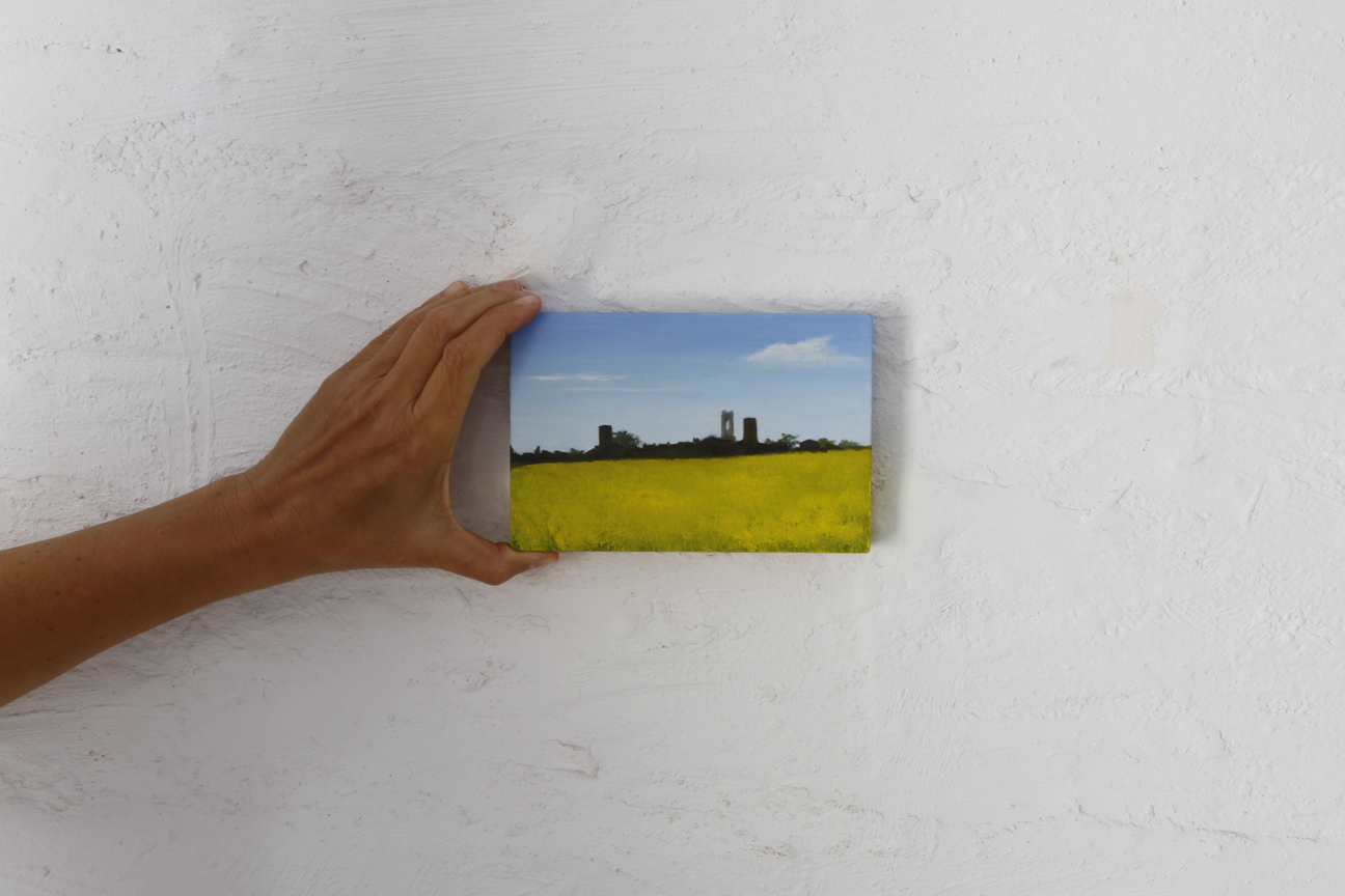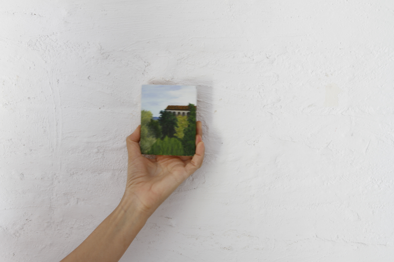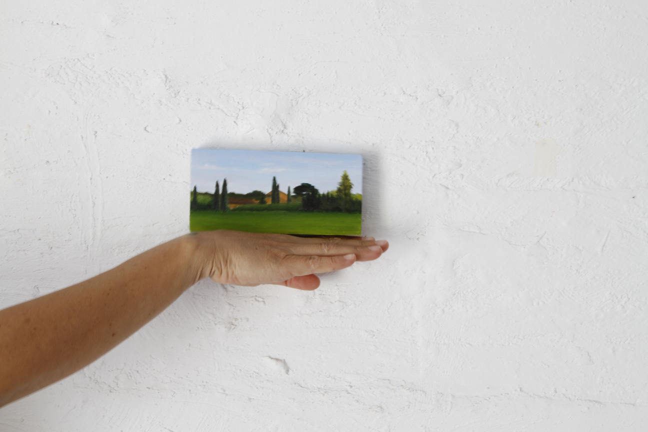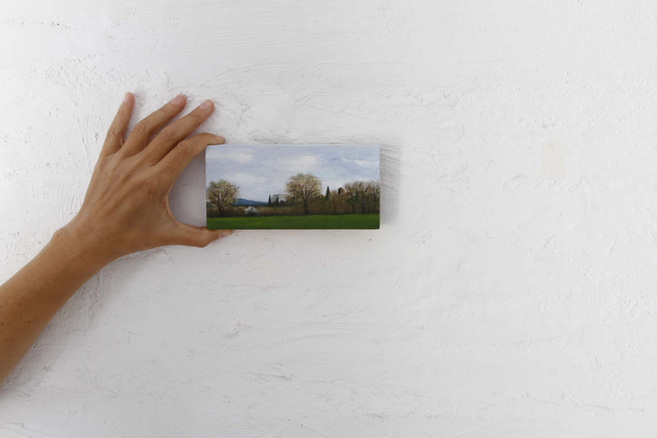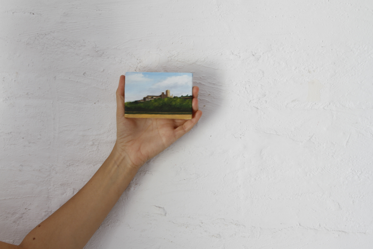 Petites fustes i retalls sobrants que poleix i prepara per a poder-hi plasmar un esbós a llapis, per a després aplicar-hi el color, sempre amb pintura a l’oli. Els blaus del cel, els grisos i roses dels núvols, la gradació dels verds de les Gavarres fins al dels camps cultivats, grocs i vermells a la primavera. Com deia Chardin “Va posant color fins que li surt“, al final ja no sap si pinta el que veu o veu el que pinta. I té tota la raó, perquè la mirada és sempre educable, d’aquí la gran importància de la contemplació.