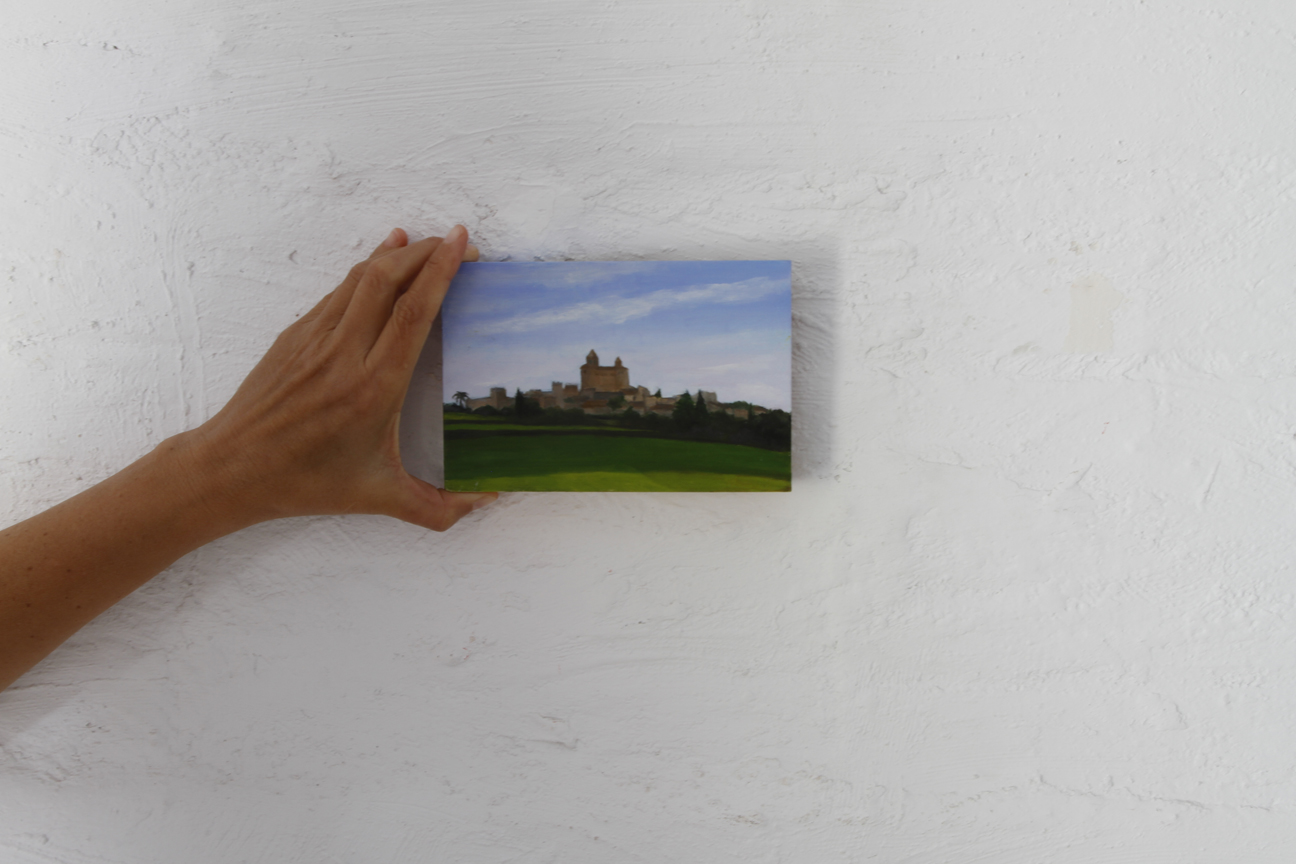 Petites fustes i retalls sobrants que poleix i prepara per a poder-hi plasmar un esbós a llapis, per a després aplicar-hi el color, sempre amb pintura a l’oli. Els blaus del cel, els grisos i roses dels núvols, la gradació dels verds de les Gavarres fins al dels camps cultivats, grocs i vermells a la primavera. Com deia Chardin “Va posant color fins que li surt“, al final ja no sap si pinta el que veu o veu el que pinta. I té tota la raó, perquè la mirada és sempre educable, d’aquí la gran importància de la contemplació.