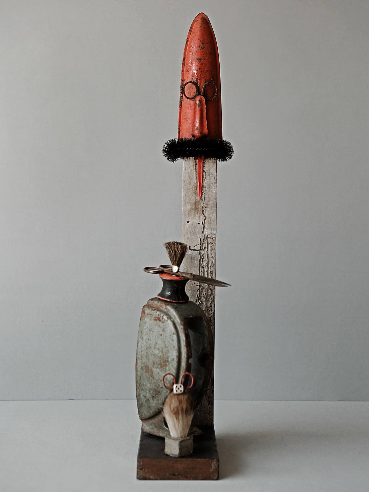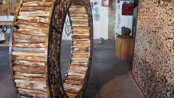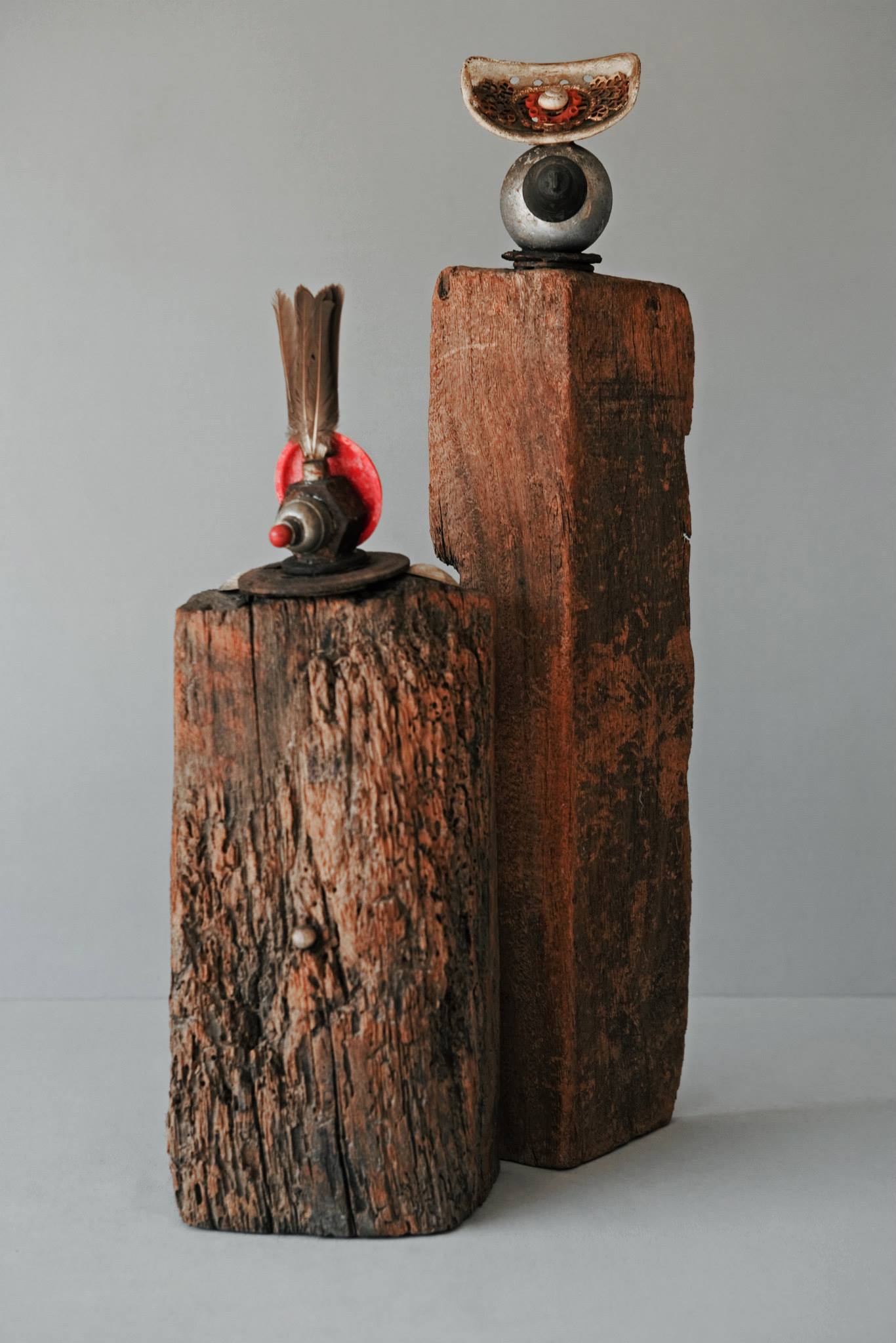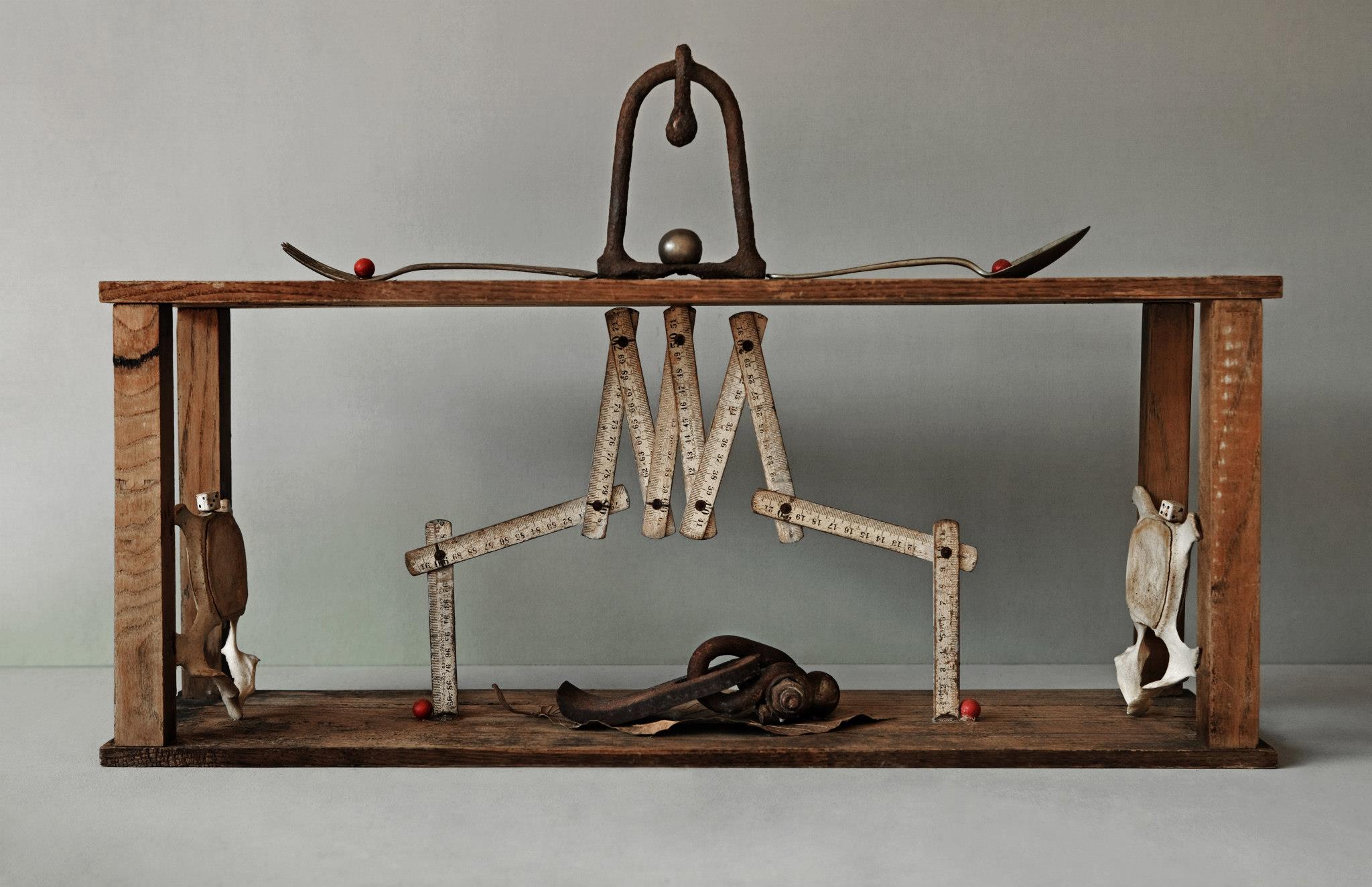 Sostreu del seu entorn, materials com la fusta, pedra i ferros dotats ja de per si d’un interès intrínsec i els aïlla i els dignifica individualment, creant-ne escultures de petit i gran format.